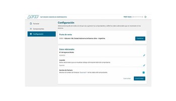 Desde el botón CONFIGURACIÓN en el menú lateral, se podrán modificar los datos de la plantilla de comprobantes o incluir un nombre de fantasía. Para agregar un nombre de fantasía acceder desde el servicio con clave fiscal “Administrador de Puntos de Ventas y Domicilios”. Cuando hayas terminado presionar CONFIRMAR para guardar los cambios.