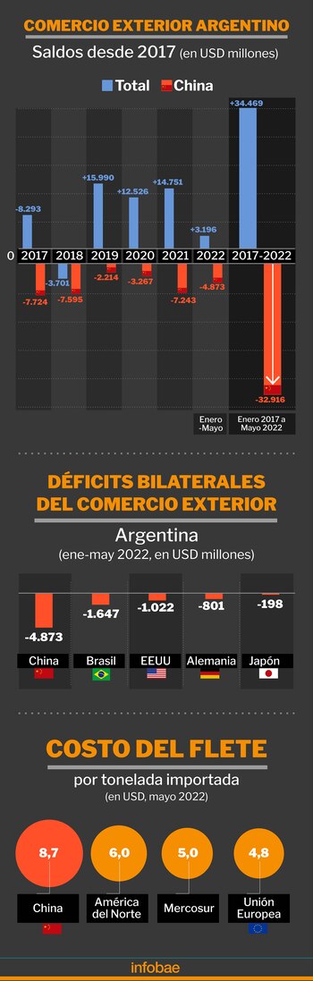 La política de confinamientos de Beijing se inició en marzo y tuvo rápidos efectos sobre el comercio exterior argentino: las ventas a China cayeron, en valor, 21% en abril y 24% en mayo. De este modo, precisa el informe del Indec sobre el Intercambio Comercial Argentino, en los primeros cinco meses del año las ventas a China fueron inferiores a las de igual período de 2021 y el déficit bilateral fue de USD 4.873 millones, muy por encima de los déficits que la Argentina tuvo con otros socios comerciales, como Brasil (1.647 millones), EEUU (1.022 millones), Alemania (801 millones) y Japón (198 millones).