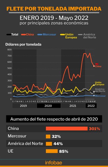 Entre abril de 2020 y abril de 2022, precisó recientemente el Indec, los fletes del intercambio con China se encarecieron nada menos que 301%, contra 85% que aumentaron los fletes del comercio con la Unión Europea, el 44% los del comercio con América del Norte y el 32% con el Mercosur.