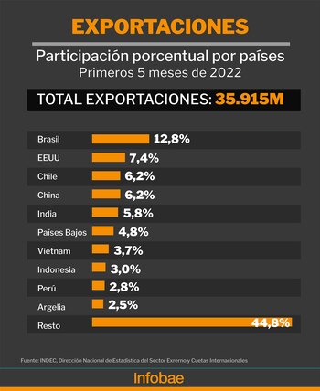 Lo cierto es que a raíz del colapso en las compras chinas a la Argentina en los últimos dos meses, en los primeros cinco meses del año las ventas argentinas al gigante asiático cayeron 0,2% respecto de igual período de 2021 y que en lo que va del año la Argentina le exportó más a Chile (USD 2.224 millones) que a China (USD 2.211 millones), que absorbió apenas 6,2% de las ventas argentinas (poco menos de 1 de cada 16 dólares), pero se mantuvo como el principal proveedor de nuestro país, con una cuota del 21,6% (más de 1 de cada 5) de las compras argentinas.