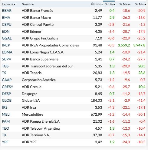 Las fuertes caídas en los índices de Wall Street, con retrocesos en un rango de 1,6% a 3%, empujaron a mayoría de bajas en las cotizaciones de los ADR y acciones argentinos negociados en dólares. Encabezaron las pérdidas Edenor (-6,4%) y Mercado Libre (-6,2%).