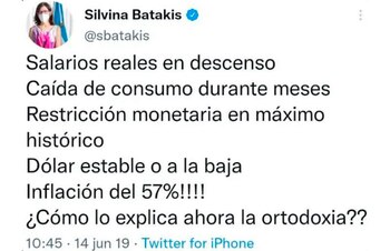 En junio de 2019, en medio de una fuerte política monetaria restrictiva instrumentada por Nicolás Dujovne para que cerraran los números acordados con el Fondo Monetario Internacional, Batakis publicó otro mensaje que marca parte de su pensamiento económico: “Salarios reales en descenso, caída de consumo durante meses, restricción monetaria en máximo histórico, dólar estable o a la baja; inflación del 57!!! ¿Cómo lo explica la ortodoxia?”.