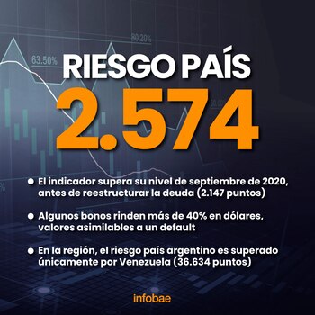 El desplome de bonos y acciones en la bolsa de Nueva York empujaron el riesgo país argentino a un nuevo récord nominal de 2.596 puntos, el más alto desde el último canje de deuda llevado a cabo por el ex ministro de Economía Martín Guzmán. Posteriormente, cerró en un valor de 2.574 unidades.