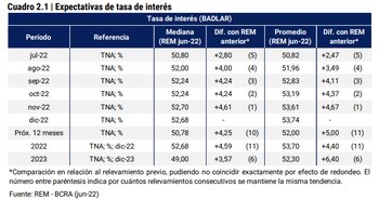 Los analistas pronosticaron también que ante este escenario inflacionario continúe la paulatina suba de tasas que mes a mes viene llevando adelante el Banco Central. El REM analiza la tasa Badlar, que es la tasa promedio pagada por los bancos privados a los plazos fijos a 30 días por un monto superior a 1 millón de pesos. Los analistas esperan para julio que la Badlar llegue a 50,8% anual, lo que representa 259 puntos básicos por encima del promedio de junio, 48,21%.
