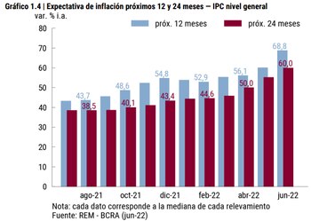 Otro dato relevado por el BCRA es la inflación esperada para los próximos 12 y 24 meses. “Respecto de la encuesta anterior, la previsión de inflación para los próximos 12 meses se elevó hasta 68,8% (+8,7 p.p. respecto del último REM). En tanto, la inflación proyectada para los próximos 24 meses (entre julio de 2023 y junio de 2024) se estima en 60,0%”, señaló el informe del BCRA.