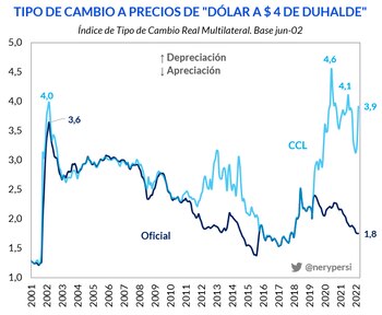 Nery Persichini, Head of Strategy en GMA Capital, sostuvo que “la cotización de $280 implica un valor, en términos del Tipo de Cambio Real Multilateral muy parecido a aquel del overshooting de (la presidencia de Eduardo) Duhalde, cuando no había cepo. El dato ajustado marca $3,90 en términos de junio de 2002, pero todavía está por debajo de los picos recientes de octubre de 2020 ($4,60) y noviembre de 2021 ($4,10 por unidad). Dicho de otro modo, está a un 15% del máximo anotado 20 meses antes, cuando fue equivalente a $330 de hoy.