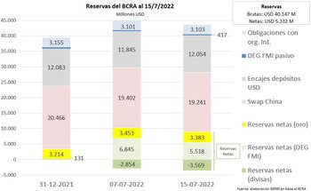 Un informe de GERES (Grupo de Estudios de la Realidad Económica y Social) indicó que según el último balance del Banco Central, actualizado al 15 de julio, las reservas totales llegaron a USD 40.147 millones, mientras que las reservas netas contabilizaron unos USD 5.332 millones. Dentro de este último item figuran USD 3.383 millones correspondientes a oro y USD 5.518 millones equivalentes en DEG (Derechos Especiales de Giro) del FMI. Sin estos aportes, las reservas estrictamente líquidas son negativas en 3.569 millones de dólares.