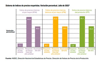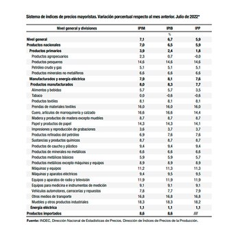 El Índice de precios internos al por mayor (IPIM) registró un aumento de 7,1% en julio de 2022 respecto del mes anterior y acumuló una suba del 64,8% en el último año y del 44,4% en el período enero-julio, según informó hoy el Indec. Esta variación es consecuencia de la suba de 7% en los “Productos nacionales” y de 8,6% en los “Productos importados”.