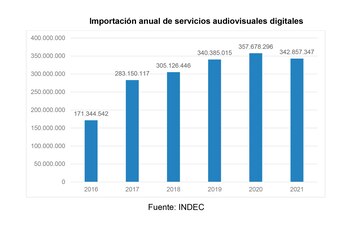 Además, se indica que hasta 2018 fueron sólo tres los países de origen de los servicios: Estados Unidos, Suecia y Francia. En 2019 se sumó Brasil; en 2020 Países Bajos, Reino Unido y Alemania; y en 2021 Canadá, España y Suiza. No obstante, los dos primeros países mencionados concentran prácticamente la totalidad de lo importado.