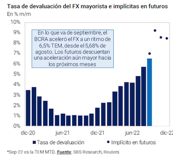 Hay que señalar que el dólar mayorista sube 6% en el último mes, desde los $135,33 del 16 de agosto a los $143,50 el 16 de septiembre. Así, la devaluación se le empieza acercar a la inflación, mensual, algo que no se producía desde hace tres años atrás.