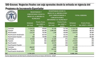 Entre el inicio del programa, el 5 de septiembre, y el día de ayer, “se operaron un total de 8.485.544 toneladas de soja, de las cuales 5,7 millones corresponden a contratos nuevos, y 2,4 a operaciones de fijación de precios. Se excluye del cómputo del volumen de operaciones las anulaciones y las anulaciones de fijación, y se consideran sólo las transacciones “finales”, según informó la Bolsa de Comercio de Rosario (BCR). Hoy, según datos oficiales a los que accedió Infobae, se sumaron 700.000 toneladas más, por lo que la venta acumulada ya superó los 9 millones de tonelada a lo largo del mes.