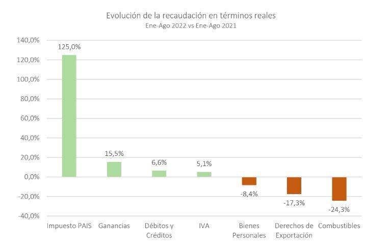 El informe precisa que la demanda de divisas por el turismo emisivo llegó a USD 794 millones en julio (el mayor nivel desde mayo de 2018, en la previa al Mundial de Fútbol de ese año en Rusia) y acumuló una salida neta de USD 3.872 millones en los primeros siete meses de 2022. “El Gobierno podría optar, como ya trascendió en diferentes oportunidades, por desdoblar el tipo de cambio y dejar de venderle divisas a los turistas, obligándolos a ir al mercado financiero a buscar los dólares para pagar los gastos en el exterior”, dice. Pero eso tendría un alto costo fiscal: en lo que va de 2022 se recaudaron $ 207.809 millones por el impuesto PAIS, 125% más que en igual período de 2021.