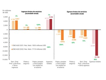 En lo que va del año, la cuenta servicios registra un déficit acumulado de USD 7.119 millones, lo que representa un incremento del 288% respecto a igual período del año pasado, traccionado principalmente por el crecimiento de los egresos brutos en concepto de “Viajes, pasajes y otros pagos con tarjeta” y, en menor medida, de “Fletes y seguros” en un contexto de mayores precios del transporte internacional de bienes.