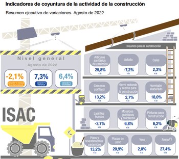 El Indicador sintético de la actividad de la construcción (ISAC) registró una caída del 2,1% en agosto respecto al mes anterior y mostró un un ascenso de 7,3% respecto a igual mes de 2021, según un informe publicado hoy por el Indec. El acumulado del período enero-junio, a su vez, presentó una suba de 6,4% respecto al mismo lapso de 2021.