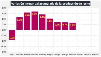 Durante septiembre se produjeron 1.073 millones de litros de leche fresca, lo que marca un crecimiento del 1,1% respecto a agosto y un 0,7% en el acumulado de los primeros 9 meses en comparación del mismo período del año pasado. No obstante, desde mayo se viene dando una tendencia de menor crecimiento en las diferencias positivas.