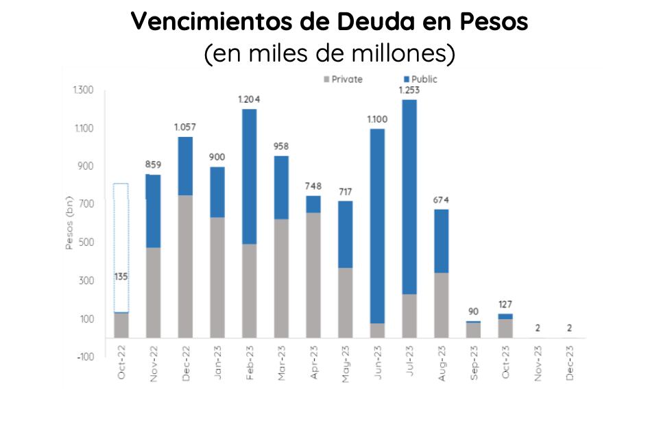 En este aspecto, desde Portfolio Personal Inversiones resaltaron que “tras tres meses consecutivos de pagos sencillos producto del canje de los duales, los vencimientos vuelven a la normalidad en noviembre”, pues “el promedio mensual en los últimos dos meses del año es de $829 mil millones; 60,5% en manos privadas”. Sin embargo, consideraron que “empiezan a ser desafiantes a partir del primer trimestre de 2023. Entre enero y marzo, el equipo de Finanzas enfrentará pagos de $1,05 billones en promedio mensual -59,2% privado-. Vale destacar que al Tesoro no le alcanza solamente con cubrir los vencimientos, sino que todavía requiere un mayor acceso en este mercado para cerrar el programa financiero”.