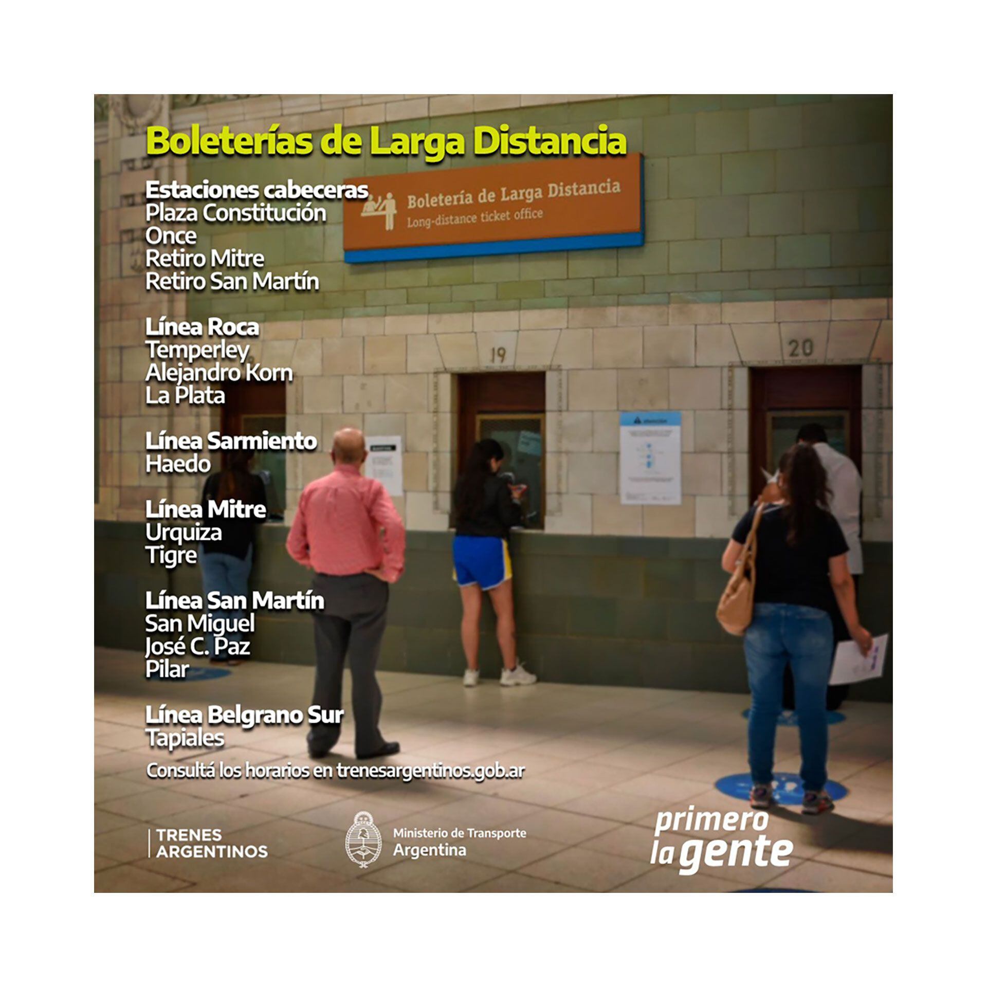 Desde hoy están disponibles los boletos de las formaciones que unen Retiro con Rosario, Córdoba, Tucumán; el martes 15 saldrán a la venta los que van hacia Junín, Justo Daract, Bragado y Pehuajó; en tanto que el 19 de noviembre los que conectan Plaza Constitución con Mar del Plata y General Guido con Divisadero de Pinamar.