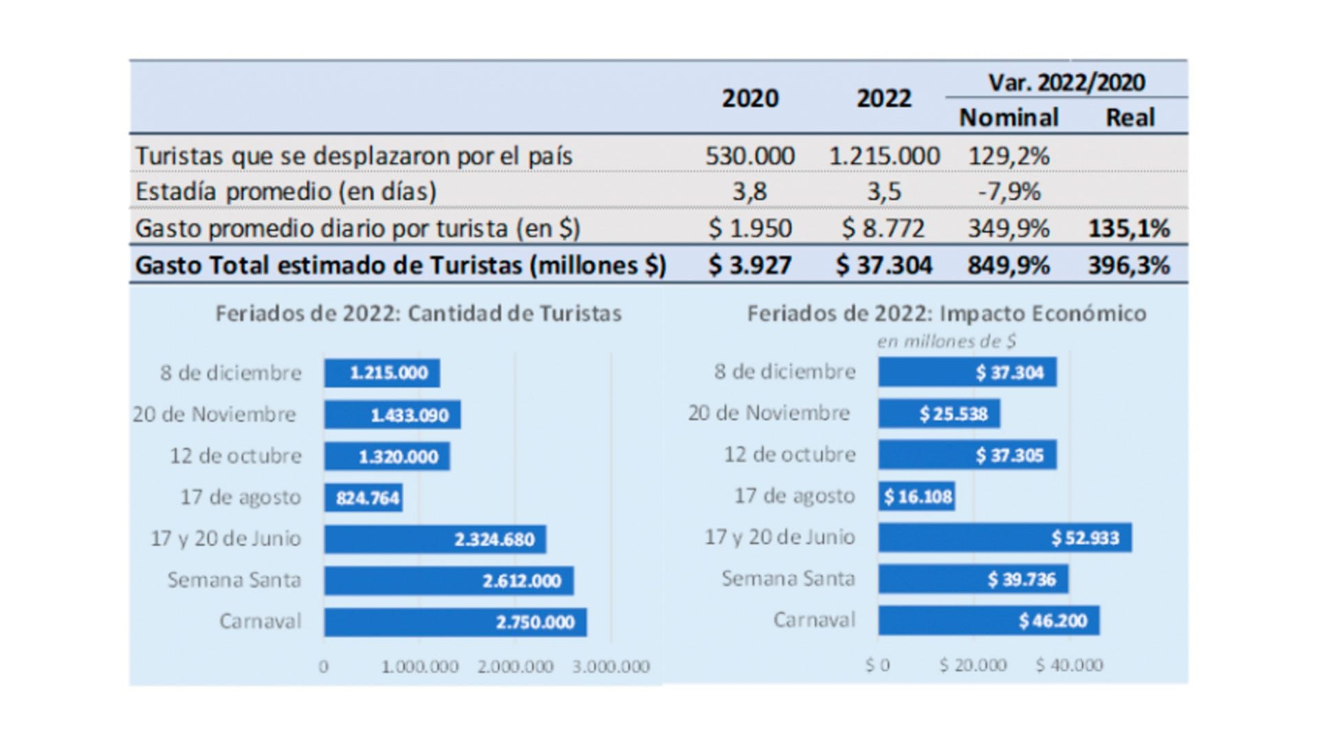 “Esto es el resultado del esfuerzo de una industria que sigue siendo uno de los principales motores económicos del país. Creemos que 2023 va a ser un año muy exitoso para el turismo argentino y nos estamos preparando, potenciando cada sector de nuestra industria, creciendo en puestos de empleo, actualizándonos e innovando de acuerdo a las nuevas necesidades que nos plantean los turistas”, agregó por su parte Gustavo Hani, presidente de la Cámara Argentina de Turismo (CAT).