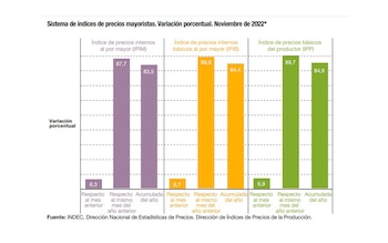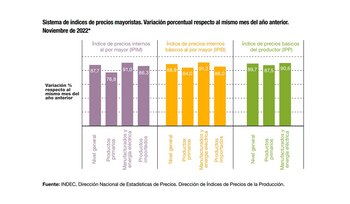 El nivel general del Índice de precios internos al por mayor (IPIM) registró un aumento de 6,3% en noviembre de 2022 respecto del mes anterior. Esta variación es consecuencia de la suba de 6,1% en los “Productos nacionales” y de 8,2% en los “Productos importados”.