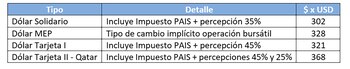 “Si las percepciones son un costo porque no podés utilizarlas o si podés tener problemas en la tramitación de las solicitudes de devolución ante la AFIP entonces no es necesario que realices la compra hoy, podrás hacerla más adelante y pagar con dólares o pesos de acuerdo con la evolución los diferentes tipos de cambio a considerar”, dijo Domínguez, apuntando a los diferentes tipos de cambio a considerar, y que se detallan en el cuadro de abajo.