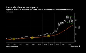 En ese momento el fabricante del iPhone cotizó en alrededor de USD 125 por acción, cerca del extremo inferior de un canal paralelo, lo que puso el foco en el promedio móvil de 200 semanas, actualmente en USD 114, un indicador técnico que ha indicado reversiones alcistas tres veces durante la última década.