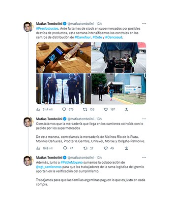 El propio secretario de Comercio, Matías Tombolini difundió el acuerdo con Moyano en un hilo en la red social Twitter. En un primer posteo, con el hashtag Precios Justos, el funcionario escribió: “Ante faltantes de stock en supermercados por posibles desvíos de productos, esta semana intensificamos los controles en los centros de distribución de #Carrefour, #Coto y #Cencosud”.
