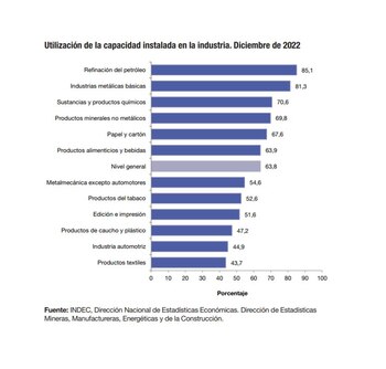 La utilización de la capacidad instalada en la industria exhibió un nivel de 63,8% en diciembre de 2022, un valor levemente inferior al registrado en diciembre de 2021 (64%).