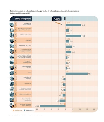 También fueron positivos los resultados de “Electricidad, gas y agua” (4,4% de mejora en relación a diciembre de 2021), “otras actividades de servicios comunitarios, sociales y personales (+4,1%), “Enseñanza” (+2,5%), “Actividades inmobiliarias” (+2,3%), “Administración pública” (+1,3%), “Servicios sociales y de salud” (+0,9%) y “Transporte y comunicaciones” (+0,7%).