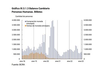 Según detalló el último informe de la autoridad monetaria Evolución del Mercado de Cambios y Balance Cambiario, las “personas humanas” operaron en enero billetes por USD 142 millones, con compras por USD 139 millones y ventas por USD 3 millones. La cifra equivale a 9% más que en diciembre pero representa una merma de USD 45 millones respecto al año pasado, cuando en el primer mes del año 1 millón de personas compraron USD 184 millones. Este año, de la cantidad de personas que operaron, 727.000 individuos compraron billetes, mientras que unos 19.000 vendieron, resultando así en compras y ventas per cápita de USD 196 y USD 177, respectivamente.