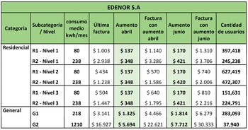 Según los ejemplos presentados por el Enre, un usuario residencial de Edenor del Nivel 1 (ingresos altos) con un consumo promedio de 238 kwh/mes que pagó cerca de $3.000 su última factura, tendrá un incremento estimado en $348 para abril y $421 para junio, donde la factura alcanzaría los $3.706 promedio. Este ejemplo abarcaría a unos 245.000 usuarios.