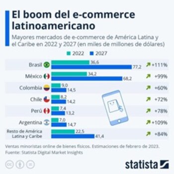 Según un estudio de Statista, las condiciones están dadas para que el comercio online en Argentina se duplique hacia al 2027. De acuerdo a las proyecciones del sitio especializado, nuestro país hoy genera cerca de USD 7 mil millones anuales por ventas online (para Datareportal son USD 9 mil millones), pero para 2027 ya podría generar cerca de USD 14.700 millones.