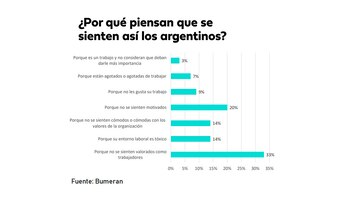 Hay muchas situaciones que explican por qué hay tantos trabajadores argentinos que no están dispuestos a trabajar más de los indispensable. De acuerdo a la encuesta de la consultora, el 33% de las personas que se encuentran en esa situación advierten que lo hacen porque no se sienten valorados como trabajadores, aunque no especifican si se trata de una cuestión netamente salarial o si existen otras causas que los lleven a sentirse así.