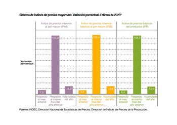 El nivel general del Índice de precios internos al por mayor (IPIM) registró un aumento de 7,0% en febrero de 2023 respecto del mes anterior. Esta variación es consecuencia de la suba de 6,8% en los “Productos nacionales” y de 9,2% en los “Productos importados”. En los últimos doce meses, el IPIM subió un 104,3%.