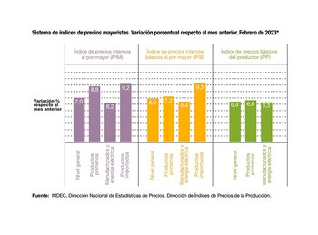 En lo que respecta al Índice de precios internos básicos al por mayor (IPIB), los productos del sector primario avanzaron un 7,2%, los manufacturados y la energía eléctrica subieron 6,4% y los productos importados un 9,3%, siempre hablando de la variación registrada entre enero y febrero de este año.