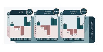 Para tener un panorama amplio, vale comenzar analizando qué ocurrió durante todo el año. Como se mencionó anteriormente, el PIB -indicador que mide el tamaño de la economía- mejoró un 5,2% en comparación al 2021, confirmando la continuidad de la recuperación que inició luego de que terminaran las medidas sanitarias restrictivas aplicadas en el marco de la pandemia del Covid-19.