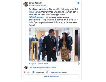 “En el contexto de la cuarta revisión del programa del FMI, mantuvimos una buena reunión con la Subdirectora Gerente del organismo Gita Gopinath y su equipo, con quienes analizamos el impacto de la sequía en el país y se valoró el despeje de vencimientos de la curva en pesos”, sostuvo en su cuenta de Twitter el titular del Palacio de Hacienda tras el encuentro.