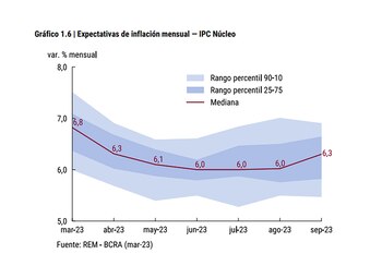 “Al igual que en el caso de la inflación nivel general, las correcciones se dieron para el conjunto de los meses relevados. Las variaciones esperadas para los meses siguientes implican una inflación promedio entre abril 2023 y septiembre 2023 en torno a 6,1% mensual”, señaló el informe del BCRA.