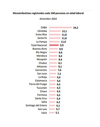 “A diciembre 2022 se registraron un total de 2,3 millones de monotributistas en Argentina. Hacia el interior del país, se observa que CABA es la jurisdicción con mayor cantidad de monotributistas cada 100 personas en edad laboral. Entre las provincias con menor cantidad de monotributistas (por personas en edad laboral) se observa una fuerte presencia de las provincias del norte, donde la pobreza incide en mayor medida”, dice otro pasaje.