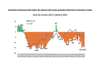 Otra constatación es que en 2022 el salario registrado privado (el más protegido contra la inflación) tuvo 7 meses de caída real, mientras el de los trabajadores informales cayó todos los meses, sin pausa. Y las expectativas no son mejores. “Ambos tipos de salarios cayeron de forma interanual en enero y febrero”, dice el trabajo.