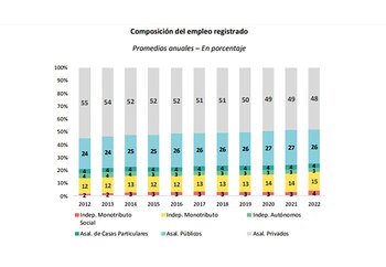 El estudio describe un mercado de trabajo cada vez más informal, con creciente incidencia de fuentes como el “monotributo social” y, entre los asalariados formales, del Estado, al punto de que el empleo privado formal, que en 2012 explicaba el 55% del empleo registrado total , ya es menos de la mitad, habiendo caído del 50% en 2019 al 48% a fines del año pasado.
