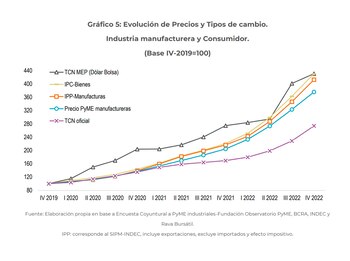 En cuanto a los precios de los productos y servicios prestados por las pymes de SSI, desaceleraron su crecimiento desde el tercer trimestre de 2022 y continuaron evolucionando muy cerca del nivel del tipo de cambio oficial. Crecieron 12,4% entre el tercer y cuarto trimestre del año, por debajo también del 18,8% del IPC general. Si se toma como referencia el cuarto trimestre de 2019, es decir la prepandemia, “la acumulación de atraso de los precios de las pyme de SSI con respecto al IPC general es notable. Debido a que los salarios del sector siguen de cerca la evolución de la inflación, las empresas están perdiendo rentabilidad durante el último bienio, lo que explica el requerimiento del sector de un tipo de cambio 70% superior”.
