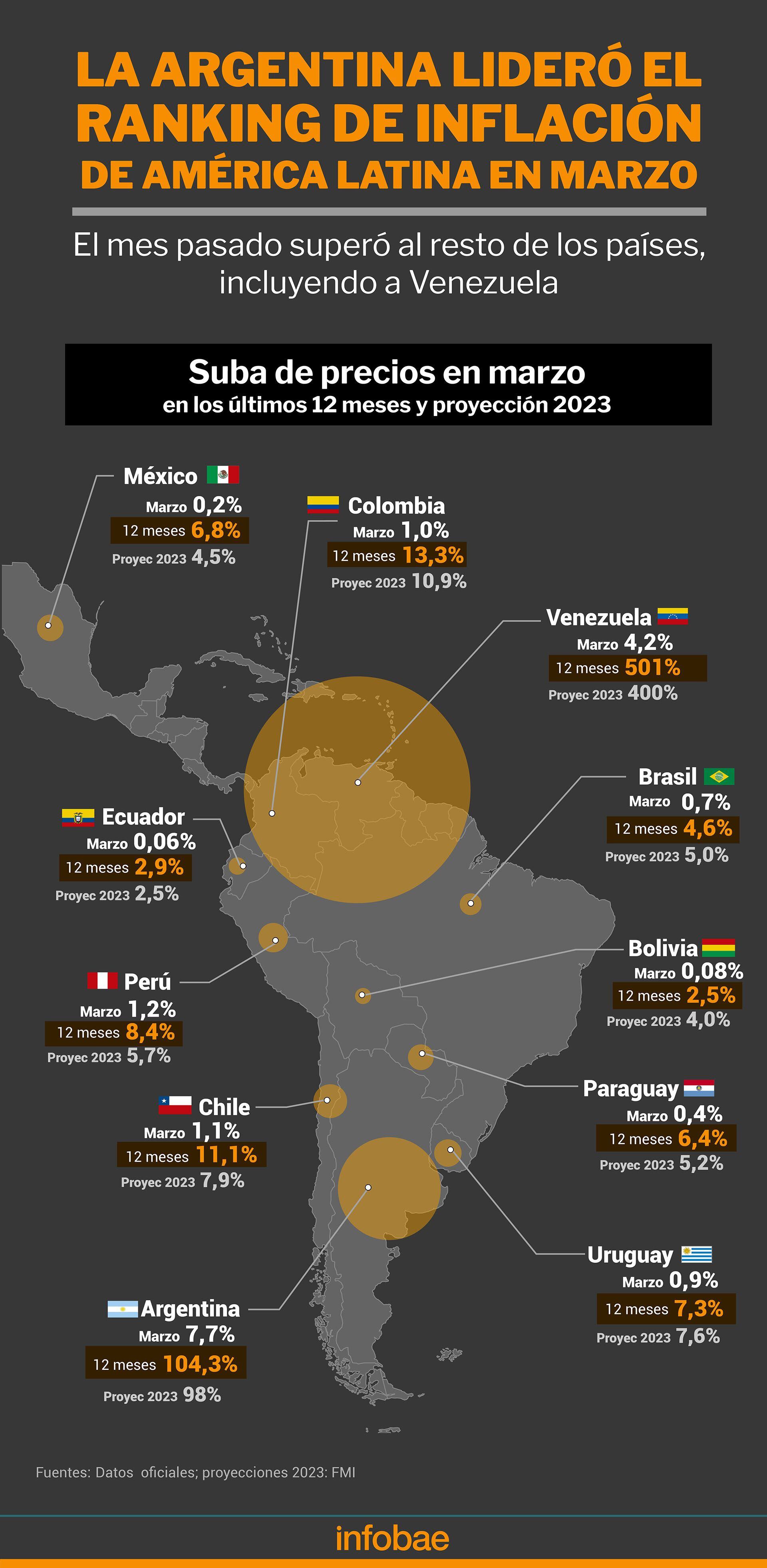 La Argentina quedó primera en el ranking de inflación de América Latina en marzo, con una cifra muy superior a Venezuela. El Indec informó que la suba de precios del mes pasado fue del 7,7% y la tasa anual ascendió a 104,3%, mientras que en el país gobernado por Nicolás Maduro llegó al 4,2% y 501%, mensual e interanual, respectivamente, según el Observatorio de Finanzas (OVF), una medición confiable.