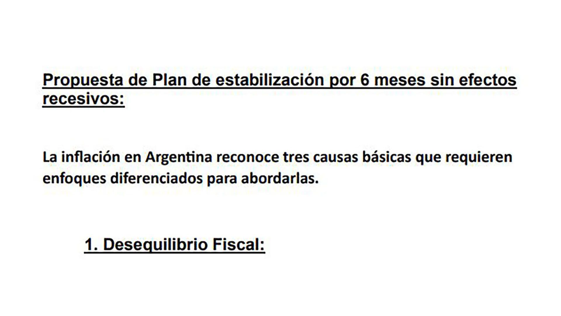 Habla de un devaluación fuerte, de 60%, aunque da otras recomendaciones al respecto; de un congelamiento de todos precios; acelerar la liquidación de exportaciones del agro; una nueva edición de la renta inesperada; evitar por “todos los medios” que cerca de las PASO las carteras de leliqs se dolaricen; “quite total” de los subsidios de energía para el 70% de los usuarios en mayo; aumento del salario mínimo a $100.000; y bono fijo de $50.000, entre otros puntos