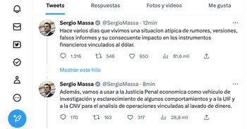 En un hilo de tuits, el funcionario indicó: “Hace varios dias que vivimos una situacion atípica de rumores, versiones, falsos informes y su consecuente impacto en los instrumentos financieros vinculados al dólar”, continuó el ministro de Economía.