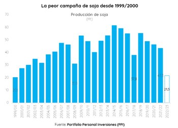 Un nuevo informe de la Bolsa de Comercio de Rosario (BCR) volvió a ajustar a la baja su estimación de producción de soja para la campaña 2022/2023, al pasar de 23 millones de toneladas en abril a 21,5 millones en mayo. En consecuencia, se proyecta un desplome de -50,3% anual desde las 43,3 millones de toneladas de la campaña anterior.
