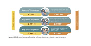 También se muestra el ejemplo de una vivienda con cinco personas, compuesta por una pareja de 30 años y tres hijos de 5, 3 y 1 año. De acuerdo a la medición, ese grupo familiar en particular necesitaría $99.023 para cubrir sus necesidades alimenticias y $213.891 para cubrir el una CBT.