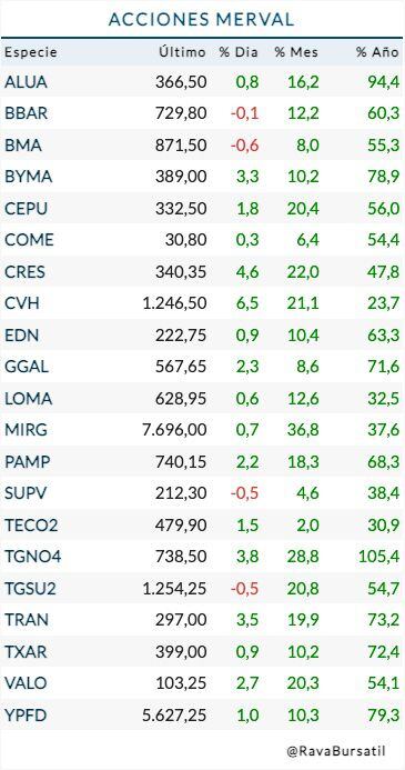 En la plaza doméstica los precios de las acciones se acomodaron al movimiento de jueves y viernes en Wall Street, cuando no hubo operaciones locales por el fin de semana largo. El acto del viernes 25 encabezado por la principal referente del oficialismo, la vicepresidente Cristina Kirchner, también animó a los inversores, ante la perspectiva de un candidato moderado para suceder a Alberto Fernández desde el arco de la coalición gobernante.