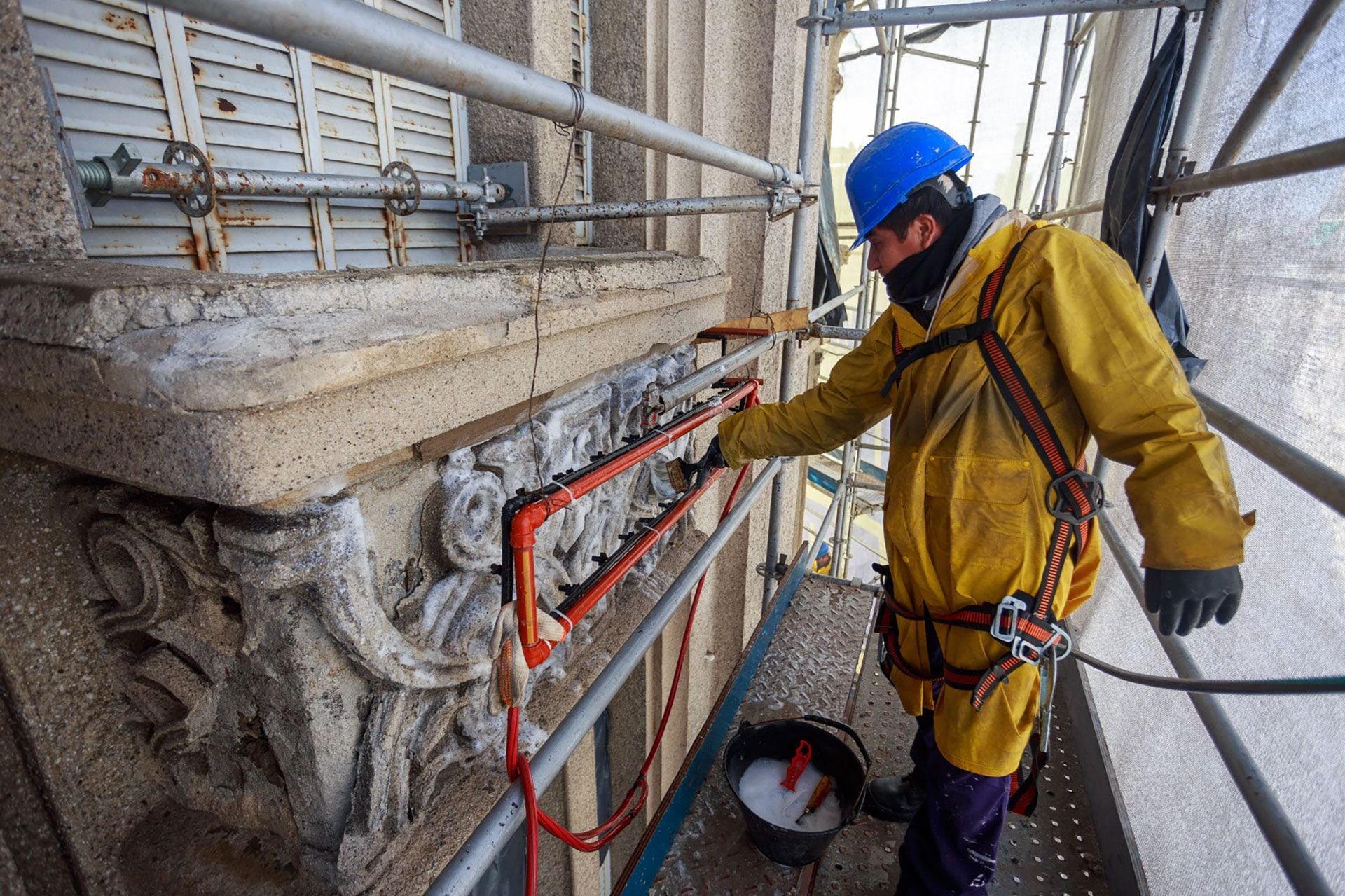 Las obras contemplaron la intervención de 1.410 metros cuadrados de superficie, la restauración de 8 “Atlantes” de la fachada –figuras humanas de 5 metros de altura que funcionan como columnas y fueron esculpidas en Europa por Franz Metzner, un maestro de la Escuela de Viena– y la incorporación de luminaria LED en todo el edificio.