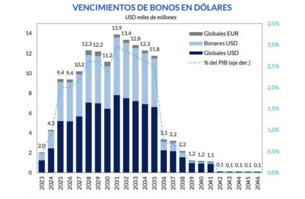 “El motivo por el cual vemos pocas chances de default de la deuda en moneda dura es porque el próximo Gobierno no tiene muchas alternativas: con reservas escasas, necesita poner el inodoro en el baño y buscar auxilio financiero entre inversores y organismos. Dentro de este contexto, los vencimientos fuertes arrancan en 2028, cuando asume el otro gobierno”, agregaron desde Wise Capital.