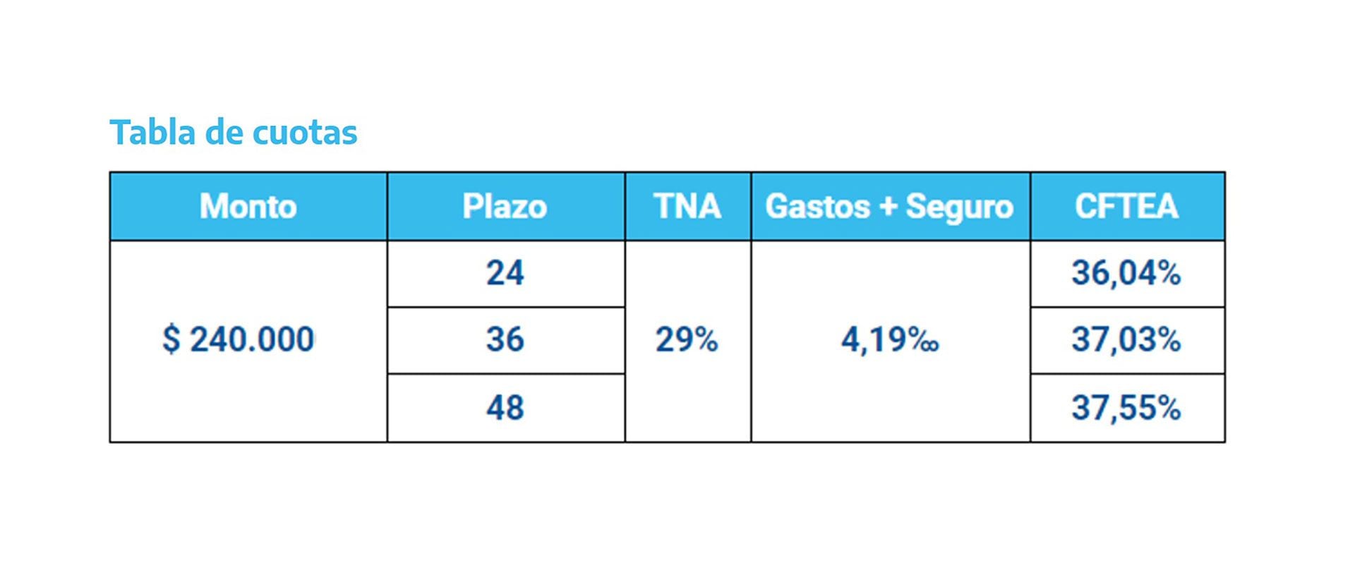 En todos los casos se pagará también un 4,19% en concepto de gastos y seguro. Las diferencias finales son mínimas, ya que quienes pidan el crédito a dos años accederán a un Costo Financiero Total Efectivo Anual (CFTEA) de 36,04%, quienes los hagan a tres años tendrán una tasa del 37,03% y quienes opten por los cuatro años tendrán una CFTEA de 37,55%.
